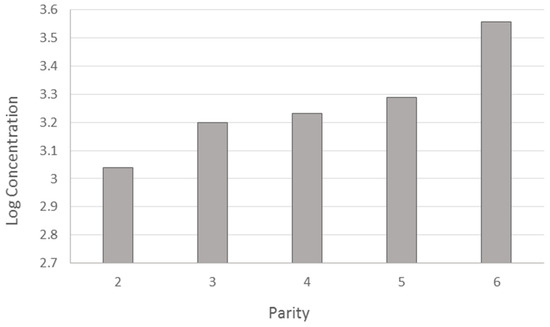 The CH4 concentration increases with parity from 2 to 6, with the buffaloes belonging to this last category being more of an emitter during milking (Figure 6). These results could be attributable both to the increase in weight (Table 3) and to the higher milk production with the increase in parity.