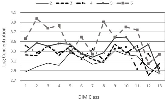 To further investigate the relationship between parity, milk, and CH4 production, the same model was fitted considering the interaction DIM*Parity and the distance from calving (day in milk) in days (270 levels) as a fixed effect.
