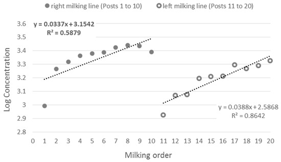 Among the other environmental influencing factors, milking order is most probably due to dominance in a hierarchical structure [59] and may be associated with milk yield, somatic cell count, and other parameters in dairy cow [60]. It remains to be clarified how this mechanism declines and why the last-entered cows within both the milking post lines are emitters more than the first. Eventually, regarding management, operators, of both laser methane detectors and mixer wagon, have significantly influenced the methane emission. Trained and skilled operators are fundamental when dealing with animals when using electronic or mechanical tools for precision application. A final aspect to be included in experimental design and analysis is fasting or eating and, if applicable, the distance from feeding. As shown in Table 2, the milking session had a strong influence on methane. This effect might be due to different levels of rumen fill reflecting various dry matter intake, ration composition, digestion, and rate of passage [61,62].