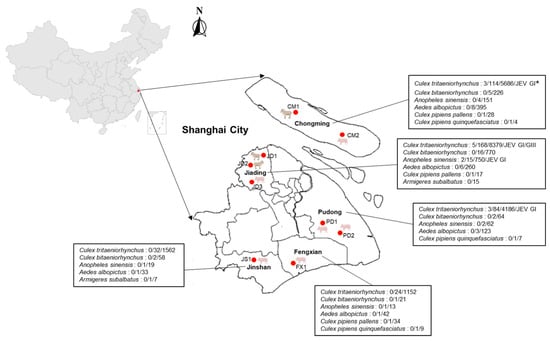 | Jiading | Sheepsties | C. tritaeniorhynchus | 6486 | 130 | 4 | 0.62 |
