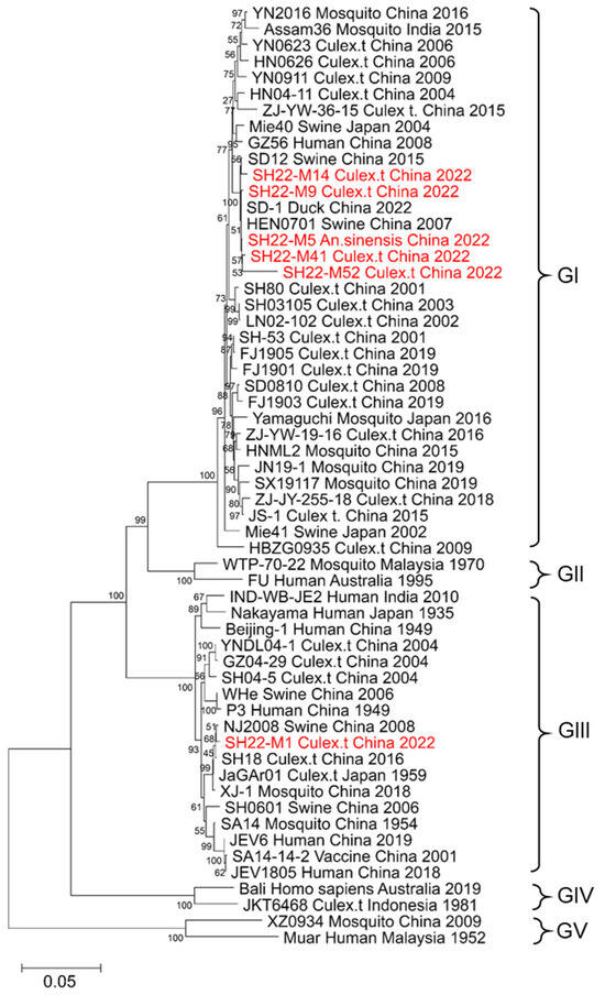 | SH22-M14 | Chongming | Pigsties | C. tritaeniorhynchus | JEV | GI |
