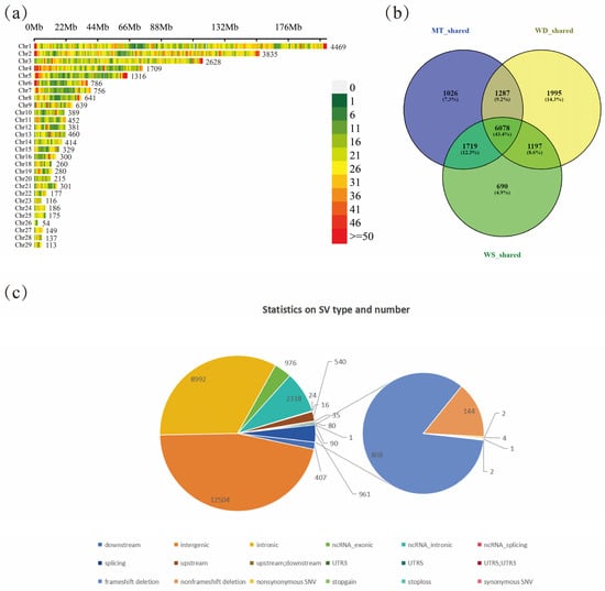 After the raw data were quality tested and filtered, the three populations obtained an average of 45 Gb of clean base per sample, with 99% and 96% Q20 and Q30, respectively, and an average GC content of 41%. To construct a comprehensive SV dataset, we analyzed sequencing data from 89 local domestic duck individuals using two software programs, LUMPY and DELLY, for SVs identification. A total of 21,673 SVs were identified in this analysis, with an average of 240 SVs per individual. Compared to other studies, the number of SVs identified in this study is relatively modest. For instance, Wang et al. reported the identification of 101,041 SVs across 131 duck genomes, yielding an average of 770 SVs per individual [7]. This inconsistency can be attributed, in part, to differences in the number of varieties and individuals included in the analysis. Additionally, factors such as the construction of the pan-genome and the use of various SV detection tools also influence the total number of SVs identified. Chromosome 1 exhibited the highest number of SVs (4469), while chromosome 26 had the lowest (54), indicating an uneven distribution of SVs across chromosomes (Figure 2a). This variation correlates with chromosome length and mirrors the distribution patterns observed for SNPs and runs of homozygosity (ROH). We found that the higher SV densities were mainly located at the ends of the long chromosomes, with particularly notable expressions on chr1, 2, and 5. In general, chromosome length appeared to be positively correlated with the distribution and frequency of SVs. However, this relationship is influenced by multiple factors, including but not limited to the physical length of the chromosome, the distribution of functional regions, recombination rates, and the methodologies employed for SV detection. Additionally, we analyzed the total number of SVs identified across all individuals from the three varieties—MT, WS, and WD—finding 10,110, 9684, and 10,557 SVs, respectively. The number of variety-specific SVs was 1026 for MT, 690 for WS, and 6078 for WD, while 1995 SVs were shared across all three varieties (Figure 2b). Regarding SV types, the majority (46%, or 9460 SVs) were located in intergenic regions. Intronic regions contained the second highest proportion of SVs at 33%. Within exonic cregions, frameshift deletions were the most prevalent, accounting for 3% of the total SVs, followed by non-frameshift deletions at 1% (Figure 2; Tables S1 and S2).
