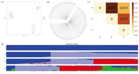 Population structure analysis of three local domestic duck breeds: (a) principal component analysis; (b) neighbor-joining tree; (c) population differentiation indices; (d) population structure analysis. K: number of subgroups of the population.