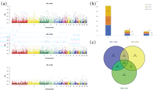 In this study, we first filtered the VCF file with parameters set to MAF of 0.05 and a ---max-missing rate of 0.7. As the count went on, 21,673 SVs ended up with 9125 SVs being retained. We then applied the Fst method to detect SV differences among the three duck breeds (Figure 4a). The SVs with the top 5% Fst values were selected as candidate regions for analysis. Our findings showed that 883 selected SV loci between MT and WS ducks, 1004 selected SV loci between MT and WD ducks, and 891 selected SV loci between WS and WD ducks. To investigate the impact of these SVs on gene function, we successfully annotated 473, 601, and 493 genes using the g:Convert tool from the g:Profiler website, for each comparison, respectively. These genes were then subjected to GO and KEGG enrichment analyses (Tables S3 and S4). Significantly enriched pathways were identified using a threshold of p < 0.05. A total of 304, 262, and 255 significantly enriched GO terms were identified in the WD vs. WS, MT vs. WS, and MT vs. WD comparisons, respectively (Figure 4b). In contrast, fewer significant KEGG pathways were identified, with only nine pathways detected across all three subgroups.