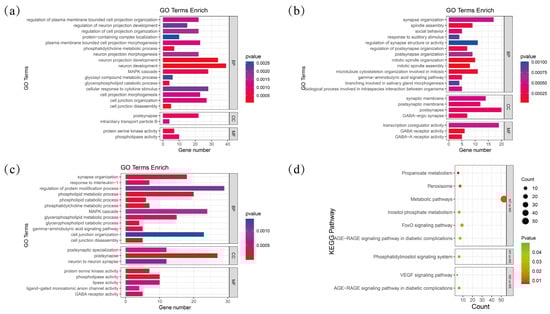 Functional enrichment analysis of genes in different subgroups: (a) GO enrichment analysis in the subgroups of MT and WD; (b) GO enrichment analysis in the subgroups of MT and WS; (c) GO enrichment analysis in the subgroups of WD and WS; (d) KEGG enrichment analysis in the subgroups of MT and WD, MT and WS, and WD and WS.