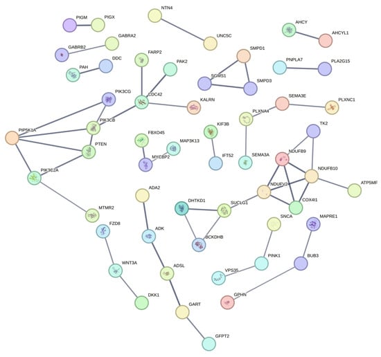 The interplay between nervous system development and tissue metabolic activity represents a complex and interesting biological process. In this study, we sought to identify common protein molecules and their associated functional genes involved in neuromodulation, energy metabolism, and reproductive development. This was achieved through a network analysis of protein–protein interactions. Our findings aim to enhance the understanding of the regulatory mechanisms underlying economically significant traits in local domestic duck breeds, with implications for their selection and breeding. We utilized the STRING database to perform a PPI network analysis on 207 genes associated with key biological processes in the three duck species (Figure 6). These processes included neural development (GO term), mitotic spindle assembly activities (in the MT and WS subgroups), and energy metabolism (in the WD and WS subgroups). After removing isolated nodes and setting a high confidence threshold of 0.700, we identified two significant protein interaction networks. The first network included CDC42, PIK3CB, PIP5K1A, PIK3CG, PTEN, and PIK3C2A. The second network comprised NDUFB9, NDUFB10, NDUFV2, COX4I1, and TK2. Literature review indicates that CDC42 may serve a critical bridging role in both neural development and energy metabolism. This suggests that CDC42 could be a key regulatory protein influencing multiple essential biological pathways in these duck populations.