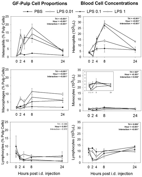 Apart from lymphocytes and their subpopulations in GF-pulps, statistical analyses revealed treatment-by-time interactions for heterophil and macrophage proportions (% pulp cells) in GF-pulps, as well as for concentrations of heterophil, monocyte, and lymphocytes in the peripheral blood, indicating that the different treatments resulted in different response profiles over time. Specifically, i.d. pulp injection of PBS vehicle did not result in changes of heterophil, monocyte/macrophage, and lymphocyte levels in pulps and peripheral blood over the 24-h study (Figure 1). Separate analysis of LPS treatments (LPS 0.01, LPS 0.1, and LPS 1) revealed time effects (p < 0.001) for each treatment group. Injection of the lowest LPS dose (LPS 0.01; 0.01 μg/GF) resulted in high levels of heterophil infiltration by 2 h post pulp injection (p.i.) and remained near these elevated levels at 4 and 8 h, before decreasing to above pre-injection levels by 24 h (Figure 1). For LPS 0.1 and LPS 1 dosages, pulp heterophil levels were elevated by 4 h p.i and remained at that level for LPS 0.1 but further increased with LPS 1. By 24 h, pulp heterophil levels returned to near pre-injection levels for both LPS 0.1 and 1. In the blood, heterophil concentrations (103 cells/μL of blood) were also affected by i.d. pulp injection of LPS (time effect p < 0.001), with LPS 0.01 resulting in elevated heterophil concentrations at 2 h p.i., reaching maximal levels by 4 and 8 h before returning to pre-injection levels by 24 h. Higher dosages of LPS resulted in a drop (p ≤ 0.05) of heterophil concentrations at 2 h, then increased greatly by 4 h, reaching peak levels by 8 h. By 24 h, heterophil concentrations returned to pre-injection levels with LPS 0.1, whereas with LPS 1, concentrations remained elevated, dropping to levels observed at 4 h p.i. (Figure 1).