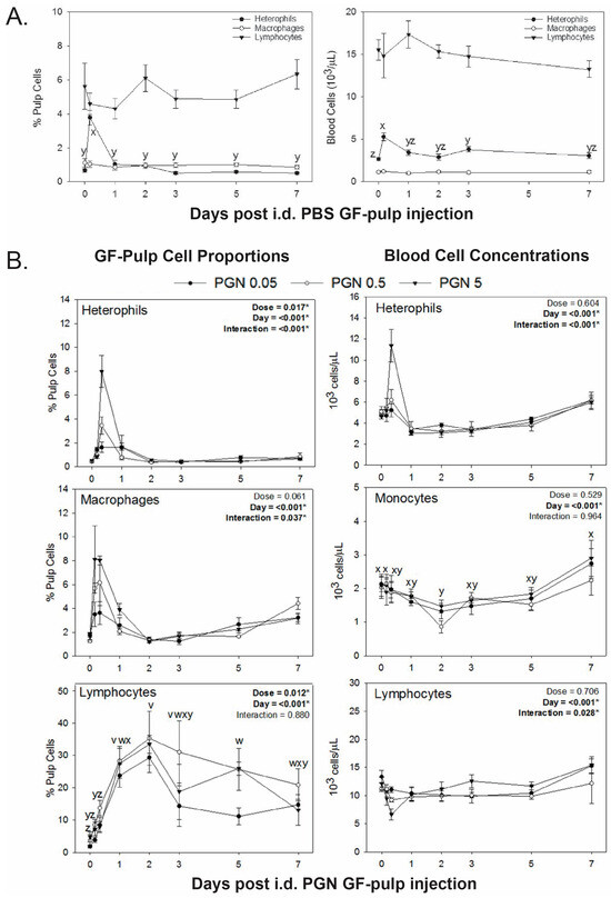 Two-way analysis of PGN treatments (PGN 0.05, 0.5, and 5) revealed treatment-by-time interactions for GF heterophil (p < 0.001) and macrophage (p = 0.037) infiltration and heterophil (p < 0.001) and lymphocyte (p = 0.028) concentrations in blood (Figure 2B). Injection of the lowest PGN dose (PGN 0.05), resulted in elevated heterophil infiltration at 8 h and 1 d, whereas for PGN 0.5 and PGN 5, heterophil levels were only elevated at 8 h. PGN 5 resulted in the highest heterophil infiltration. In the blood, heterophil concentrations were not affected by PGN treatments, except for elevated levels (p ≤ 0.05) at 8 h following intradermal pulp injection with PGN 5.