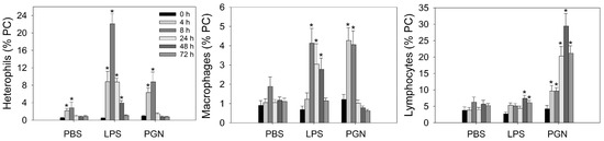 Treatment comparisons revealed that heterophil and macrophage infiltration were higher with LPS and PGN than PBS injection, whereby heterophil levels were highest with LPS and those of macrophages were similarly high with LPS and PGN (Figure 3). However, macrophage levels were elevated earlier (4 h vs. 8 h) but returned to baseline levels earlier (24 h vs. 72 h) with PGN than LPS, respectively. Infiltration of lymphocytes, and the various lymphocyte subpopulations examined, was highest in response to PGN injection and equally low in response to PBS and LPS administration (Figure 3, Table 3).