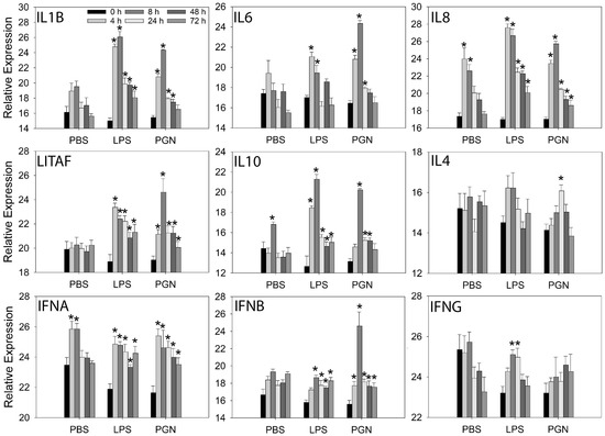 Injection of endotoxin-free PBS vehicle, resulted in few cytokine gene expression changes, with elevated levels (p ≤ 0.05) observed only for IL8 at 4 and 8 h, IL10 at 8 h, and IFNA at 4 and 8 h (Figure 4).