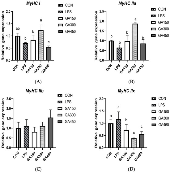 Effects of dietary GA on the mRNA expression of MyHC I (A), MyHC IIa (B), MyHC IIx (C), and MyHC IIx (D) in pectoral muscle. Data are means ± SEM of six replicates per treatment (25 birds per replicate). CON: basal diet and saline injection; LPS: basal diet and LPS challenge; GA150: basal diet supplemented with 150 mg/kg gallic acid and LPS challenge; GA300: basal diet supplemented with 300 mg/kg gallic acid and LPS challenge; GA450: basal diet supplemented with 450 mg/kg gallic acid and LPS challenge. Bars labeled with different letters significantly differ (p < 0.05).