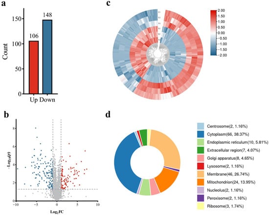 The boar X/Y sperm samples were used in a proteomic study. The quantitative proteomic analysis of sex-specific antigens was performed using a label-free quantitative method. The results of this protein mass spectrometry data analysis showed that the total number of identified secondary profiles was 284,515, the total number of identified peptides was 21,438, the number of combined proteins was 2399 and the total number of proteins with quantitative results was 2272 (Figures S1 and S2). According to the screening criteria of fold change > 2 or <0.5 and p-value ≤ 0.05, a total of 254 significantly different expression proteins (DEPs) of X and Y sperm were screened, of which 106 were up-regulated and 148 were down-regulated (Figure 1a,b). The identified top 10 DEPs in the X sperm group and the Y sperm group were listed, respectively (Table 1 and Table 2).