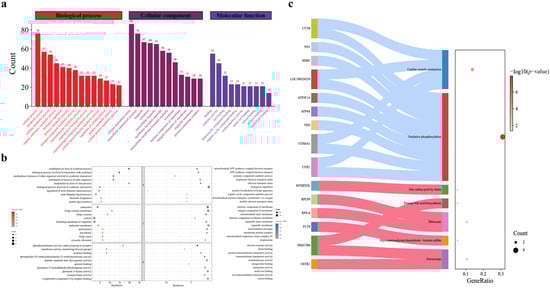 (a) GO annotations map of DEPs in boar X/Y sperm. The histogram represents the number of genes contained in the biological process, cellular component and molecular function, respectively. (b) Bubble diagram of the GO function with significant DEPs in boar X/Y sperm, p value < 0.05. The size of the bubbles represents the number of genes involved in the pathway. (c) KEGG enrichment analysis of up/down-regulated DEPs in boar X/Y sperm.