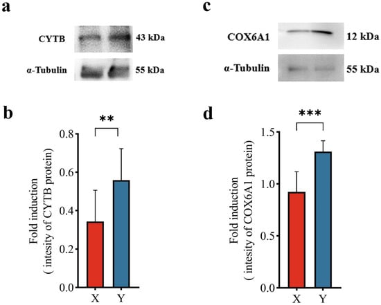 (a,c) Western blotting verification results for CYTB and COX6A1, respectively. α-tubulin was detected as housekeeping control. (b,d) Gray statistics of CYTB and COX6A1, respectively. ** p value < 0.01. *** p value < 0.001.