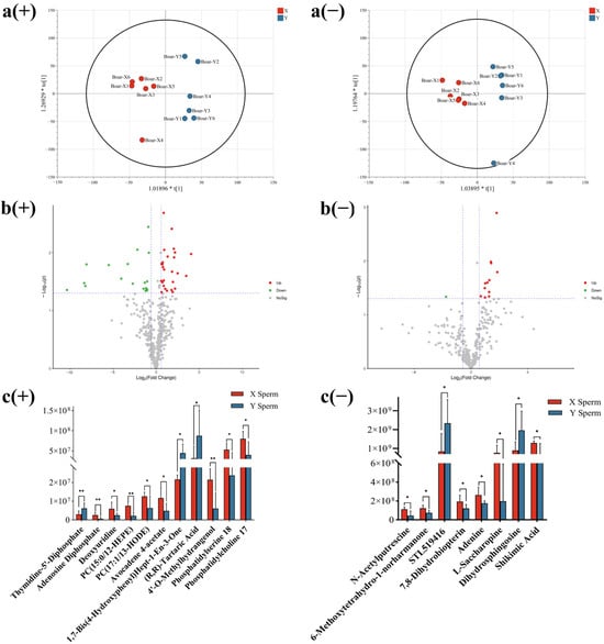 (a) Comparative OPLS-DA analysis of positive (+) and negative (−) ionic mode detected two sperm types. (b) Comparative volcano plots of positive (+) and negative (−) ionic mode detected two sperm types; fold change > 1.5 or fold change < 0.667 and p < 0.05. (c) Relative expression of DEMs of positive (+) and negative (−) ionic mode detected boar X/Y sperm, * p value < 0.05. ** p value < 0.01.