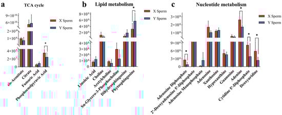 (a) Pairwise comparison of the discriminated metabolites changed in TCA cycle. * p value < 0.05. (b) Pairwise comparison of the discriminated metabolites changed in lipid metabolism. * p value < 0.05. (c) Pairwise comparison of the discriminated metabolites changed in nucleotide metabolism. * p value < 0.05.