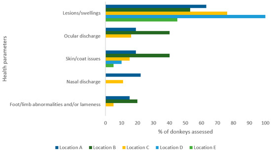 Donkey health was assessed ante-mortem by observations at a distance, with animal-based indicators of health issues—ocular discharge, nasal discharge, abnormal respiration, signs of disease/infection, skin/coat issues, lesions/wounds, scars/swellings, foot/limb abnormalities and signs of lameness—recorded as present/absent, along with Body Condition Score on a 5-point scale from 1 (poor) to 5 (obese) [21], based only on visual inspection.