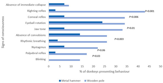 After BFT with the wooden pole, 41% (24/58) of animals righted themselves, compared to just one with the metal hammer. For animals hit with the wooden pole, 7% (4/58) showed a return of palpebral reflex, 28% (16/58) a return of corneal reflex, 19% (11/58) a return of blinking, and 21% (12/58) a return of rhythmic breathing, compared to one each (1/29), respectively, for those stunned with the metal hammer. Nystagmus was present post-impact for 17% (10/58) of those hit with the wooden pole, compared to 7% (2/29) with the metal hammer. Eyeball rotation returned for 34% (20/58) after the wooden pole compared to 14% (4/29) with the metal hammer, and jaw tone returned for 17% (10/58) of those with the wooden pole compared to 7% (2/29) for those after the metal hammer. More animals were classed as ineffectively stunned with the wooden pole compared to the metal claw hammer (p = 0.001, OR: 5.3, CI: 1.9–15.4).