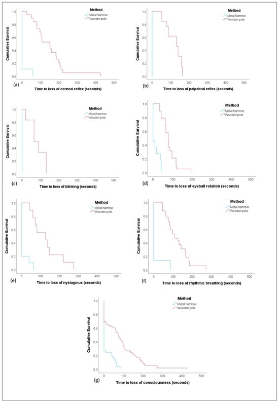 Kaplan–Meier survival curves for time to loss of consciousness signs according to BFT methods (metal hammer and wooden pole); (a) corneal reflex, (b) palpebral reflex, (c) blinking, (d) eyeball rotation, (e) nystagmus, (f) rhythmic breathing, and (g) loss of consciousness, i.e., loss of all above signs.
