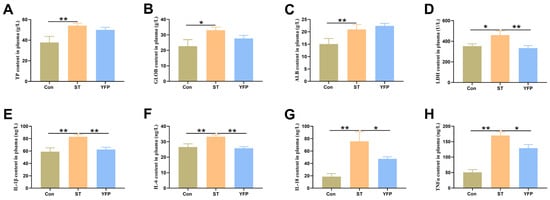 Salmonella typhimurium challenge markedly increased (p < 0.05) the concentrations of total protein (TP), globulin (GLOB), albumin (ALB), and lactic dehydrogenase (LDH) (Figure 1A–D) in plasma compared with the Con group. Dietary YFP supplementation did not protect the pigs from these changes except LDH. Additionally, the concentrations of inflammatory cytokines interleukin (IL-1β, IL-6, and IL-18) (Figure 1E–G) and TNFα (Figure 1H) in plasma were higher (p < 0.05) in the ST pigs compared to the Con pigs. Compared with ST pigs, the concentrations of IL-1β, IL-6, IL-18, and TNFα were lower (p < 0.05) in YFP pigs (Figure 1E,H).