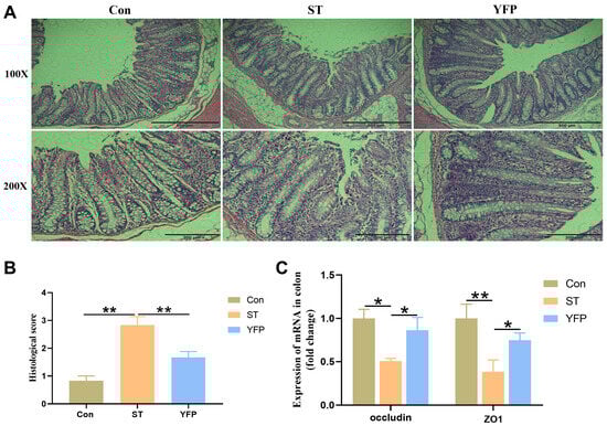 Salmonella typhimurium-infected pigs showed increased (p < 0.05) infiltration of inflammatory cells and higher histological scores in the colon mucosa compared to the Con pigs, which could be reversed by dietary YFP supplementation (Figure 2A,B). The ST group showed reduced (p < 0.05) Occludin and tight junction ZO1 expression levels in the colon compared with the Con group. In contrast, pigs fed with a YFP had higher (p < 0.05) ZO1 and Occludin expression compared with the ST group (Figure 2C).