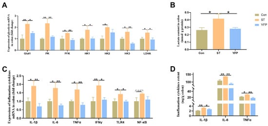 The effects of YFP on glycolysis and inflammation levels. (A) Glycolysis-related mRNA expression; (B) The concentration of lactate in the colon; (C) Inflammatory cytokines mRNA expression; (D) Inflammatory cytokine content in the colon. The values are presented as mean ± SEM, n = 6. * p < 0.05, ** p < 0.01.