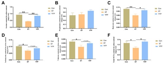 To evaluate whether alterations to the gut microbial composition influenced the fermentative capacity, the concentrations of colonic-content SCFAs were determined. Salmonella typhimurium challenge significantly decreased (p < 0.05) the concentrations of acetate, butyrate, isobutyrate, valerate, and total SCFA compared to the Con group. Dietary YFP supplementation significantly increased (p < 0.05) the concentrations of acetate, butyrate, and total SCFA. However, the Salmonella typhimurium challenge had no influence on the propionate content in the colon content (Figure 4A–F).