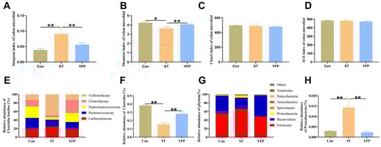 We found that the predominant phyla in the colon content at the phylum level were Firmicutes (55.79% in Con, 66.50% in ST, and 48.48% in YFP), Bacteroidetes (41.08% in Con, 25.75% in ST, and 49.51% in YFP), and Proteobacteria (1.18% in Con, 4.29% in ST, and 0.92% in YFP) were. The relative abundance of Proteobacteria, a common marker of gut dysbiosis, was higher in the ST group (4.29%) as compared to the Con group (1.18%). YFP supplementation prevented the expansion of Proteobacteria (0.92%) (Figure 5G,H).