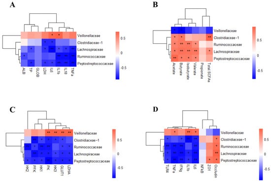 Pearson correlation analysis between the colonic microbiota and metabolism and inflammation. (A) Relationship between colonic microbiota and inflammation markers; (B) Relationship between colonic microbiota and organic acids; (C) Relationship between colonic microbiota and glycolysis gene expression; (D) Relationship between colonic microbiota and colon inflammatory cytokines. n = 4. * p < 0.05, ** p < 0.01.