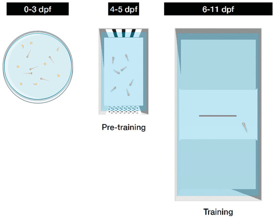 The experiment consisted of three phases: a preliminary two-day familiarization phase (6 to 7 dpf), a two-day group training phase (8 to 9 dpf), and a three-day individual training phase (10 to 12 dpf).