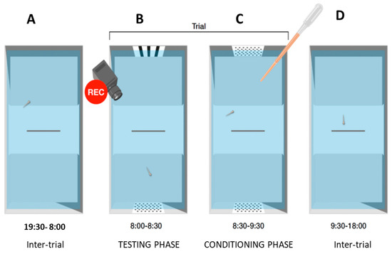 Timeline of a trial procedure (for the morning trial). (A) Subject spent inter-trial night period in a tank without stimuli. (B) At the start of the trial, two different stimuli were introduced, and preference was measured for 30 min. (C) Two different stimuli were removed and replaced with two identical stimuli (both of the reinforced type), then food was released in both compartments; larvae were left undisturbed for an hour. (D) Stimuli were removed for the duration of the next inter-trial period. A second trial was performed in the afternoon from 18:00 to 19:30 with an identical procedure.