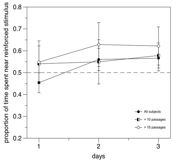 When evaluating learning performance, in accordance with the previous study, we excluded from the analysis subjects with a low rate of passages. With the 10-passages cutoff used in the previous study, in our experiment the preference for the reinforced stimulus did not reach significance. This could also be due to statistical power issues, since, with this cutoff, only eight subjects out of twenty-four remained in the final sample. A significant preference was observed when a more selective cutoff (at least 15 passages in six trials) was adopted, although in this case, the sample size was further reduced to five. A direct comparison of the two experiments evidenced a significantly lower performance in the replication experiment.