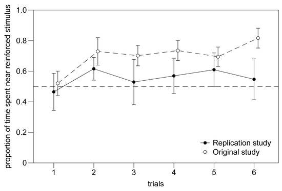 Firstly, this experiment highlighted a problem of very high mortality, with 50% of the subjects (24 out of 48) dying during the course of the experiment. This figure contrasts sharply with a mortality rate of less than 5% in other experiments conducted in the same laboratory (e.g., [43]), but is also significantly higher than that observed in the experiment we replicated (29%). Additionally, the number of larvae with low inter-compartment mobility was found to be very high and significantly greater than that recorded in the original study. The larvae that passed fewer than 10 times from one compartment to the other in total in the six trials (the exclusion criterion adopted in the previous study) accounted for 67% (compared to 43% in the previous study). It is possible that these two phenomena are related. With our procedure, two meals per day were provided. This quantity is the minimum required for larvae of this age. Subjects that happened to be in the non-reinforced compartment at the time of stimuli introduction needed to move into the opposite compartment to consume the reward. Consequently, subjects with poor mobility had a great chance of not passing into the rewarded compartment before the food degraded (usually 10–15 min), hence increasing the risk of dying of starvation.