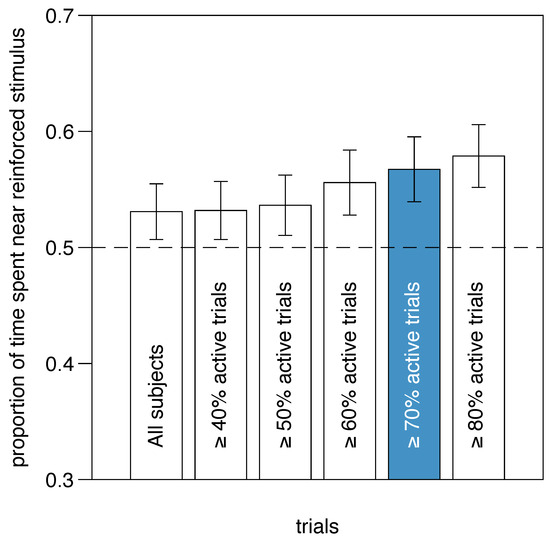 Experiment 2. Learning performance as a function of stringency of inclusion criteria. Inclusion criterion was percentage of trials in which a subject performed at least one passage between the two compartments (i.e., active trials). Performance improves as more selective criteria for inclusion are applied, suggesting that less active larvae may not have learned the task. Given the tradeoff between selectivity and sample size, we used a 70% threshold (highlighted in blue) for further statistical analysis.
