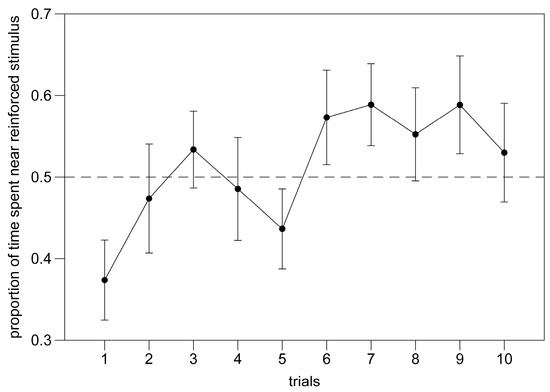 For technical reasons, data could not be collected for five out of thirty-two subjects in the 12th trial; these were treated as missing values in the analyses. An overall analysis of performance was conducted on the average performance of the second to sixth day of training (trials 3–12). Trial 1 was excluded because the morning session on the first day preceded the first reinforcement, and trial 2 was excluded because the afternoon session followed only a single reinforcement. Although there are instances where learning occurs after a single appetitive or aversive event, such cases are rare. In most species, including zebrafish, a single reinforcement provided through appetitive learning protocols is generally insufficient to induce learning [41,42]. Overall, subjects showed a significant preference for the reinforced stimulus: (mean ± std. dev: 51.8 ± 1.61; one-sample t-test, t(9) = 3.363, p = 0.008). We did not find a significant correlation between average number of passages between compartments and performance (Pearson’s product-moment correlation, rho(30) = −0.197, p = 0.280).