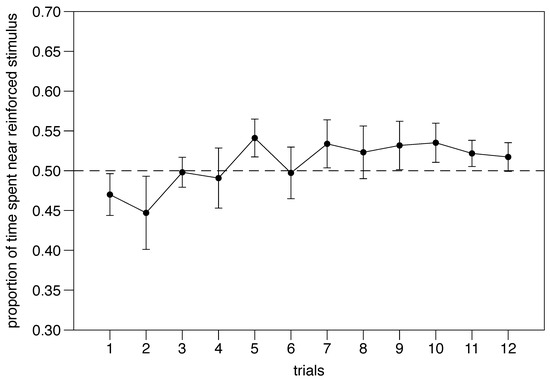 Performance through trials 1–12 was analyzed with a mixed model ANOVA. We found no significant effect of trial (F(1,368) = 1.456, p = 0.228; Figure 9), a significant effect of the reinforced stimulus (F(1,368) = 66.646, p < 0.001), and a significant trial x stimulus interaction (F(1,368) = 6.209, p = 0.013); the number of movements between compartments had no significant effect on the performance (F(1,368) = 0.174, p = 0.677). All other interactions were not significant (p > 0.296).