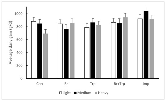 Effect of dietary neuroleptic or Improvac and weight class on average daily gain between 17 and 22 weeks of age. The error bars are the least significant difference (LSD) for weight × treatment = 134 g/d.