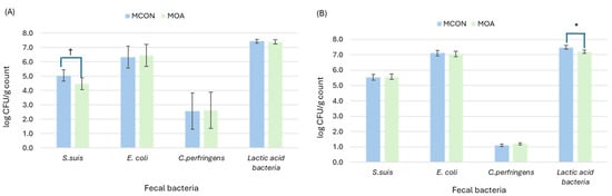 Plating microbial count from lactating sows (A) and suckling pigs (B) as affected by sows fed control (MCON) or SCFAs-MCFAs supplementation (MOA) diet at 7 d after farrowing. Data from sows were analyzed with microbial counts at 0 d as covariable. Data from suckling pigs is mean of 3 samples from 24 L per experimental diet. Asterisk (*) and cross (†) symbol indicates significant differences (p = 0.020) and tendencies (p = 0.083), respectively.