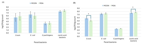 Plating microbial count from lactating sows (A) and suckling pigs (B) as affected by sows fed control (MCON) or SCFAs-MCFAs supplementation (MOA) diet at 20 d after farrowing. Data from sows were analyzed with microbial counts at 0 d as covariable. Data from suckling pigs are means of 3 samples from 24 L per experimental diet. Asterisk (*) symbol indicates significant differences (p < 0.05).