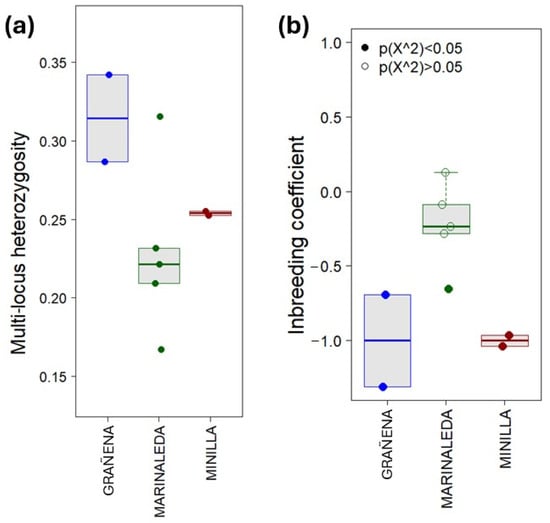 The nine samples were sexed as females. Figure 2 shows the individual genomic diversity as multi-locus heterozygosity (Figure 2a) and inbreeding coefficient (Figure 2b). Samples from Grañena showed the highest mean levels of multi-locus heterozygosity, while Marinaleda showed the lowest. The dispersion of the values was highly significant in the Marinaleda remains.