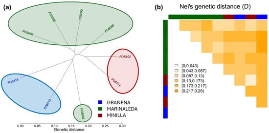 Although the genetic distances between sites are not very large (approximately between 0.08 and 0.12), it is evident that the most genetically similar animals are those from La Minilla and Marinaleda, while the most genetically distant are those from Grañena Baja and La Minilla (Figure 5). Nevertheless, we have detected a significant level of genetic homology between samples from two different sites. Specifically, an individual from Marinaleda (FOS82) shows genetic similarity with an individual from Grañena Baja (FOS113), as illustrated in the dendrogram of genetic distances (Figure 4a,b).
