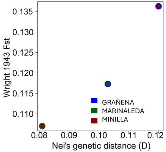 A comparison of the genetic distances of Fst from Wright 1943 and Nei (D) are shown in Figure 5. Both genetic distances show the same tendency, with the most similar sites being the Marinaleda and La Minilla sites, while the most genetically different animals are those belonging to the Minilla and Grañena sites.