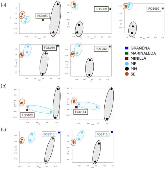 At the Marinaleda site, most of the samples analysed are equidistant from the current breeds, but with greater similarity to the Black Merino, a trend that is also observed in the Grañena Baja site (Figure 7a,c). However, one of the samples (FOS059) showed similar genetic distances to ME and MN. This could indicate that this individual resembles the endemic animals, but with some features of breeds with greater wool aptitude.