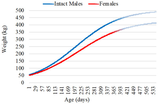 The animals used in the study were born in May, were initially kept as suckling calves, and were weaned at 7 months of age. During their growth, they received the following supplementary feeding: For 209 days, a pre-starter ration was provided at a rate of 700 g per animal per day. This ration consisted of 18% crude protein (CP), 2.5% ether extract (EE), 7% fibre (F), 13% moisture (H), and 10% ash; after 150 days of starting the previous supplementary feeding, for an additional 145 days, they were supplemented with 2600 g per animal per day of a ration containing 40% CP, 2% EE, 15% F, and 18% H. During the last 80 days of the study, they also received 18 kg of corn silage and 3700 g of corn flour per animal per day. The data collected consisted of a series of monthly weights from birth to 12 months of age, including a total of n = 27 female calves and n = 20 intact male calves. The calves were weighted in a weighing platform Gradil De Madeira GP2800 Pesagem Bovina, with an LD 1050 display. The calves were weighed at 09:00 a.m. local time, and no feeding restrictions were applied before weighing, and therefore any possible weighting bias based on gut filling was minimized. The growth curves were adjusted based on the average weights of intact males and females at various ages (in days).