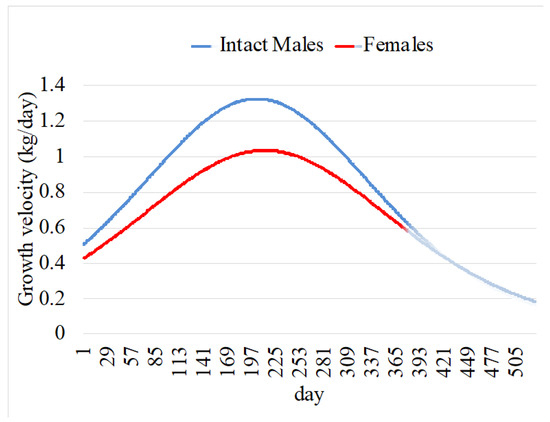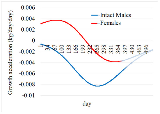 The growth patterns of gender differ due to hormonal, metabolic, and physiological factors [41]. Intact males also exhibit superior feed efficiency, converting feed into muscle more effectively [42]. Intact males grow faster, larger, and for a longer duration due to testosterone, which promotes muscle accretion and delays fat deposition, leading to a higher lean-to-fat ratio. Females, on the other hand, exhibit earlier fat deposition due to estrogen production, reducing growth velocity and limiting overall size [43,44]. Growth velocity peaks later intact males and is sustained longer, whereas in females, it peaks earlier and declines with fat deposition as they mature [45]. Growth acceleration, the change in growth velocity, is greater and prolonged in intact males due to their later maturity, and this was previously reported for Nelore cattle [46].