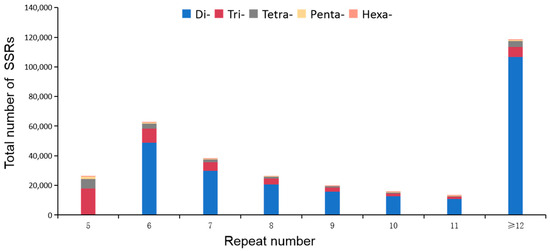 A total of 271 SSR repeat types (motifs) were found in the A. latus genome (Table S3). Of these SSRs, there were 4, 10, 32, 94, and 131 types of dinucleotide, trinucleotide, tetranucleotide, pentanucleotide, and hexanucleotide motifs, respectively (Table S3). The distribution of SSRs in relation to the number of repeat units is shown in Figure 1. The repeat number of all of these motifs ranged from 5 to 319, mainly between 5 and 12 (>10,000) (Figure 1).