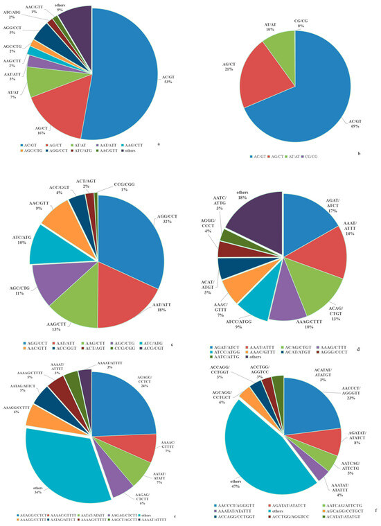 The 10 most abundant SSR repeat motifs are listed in Table 2 and Figure 2a. They contained three dinucleotide types, six trinucleotide types, and one tetranucleotide type. The most abundant SSR type was the AC repeat (168,390, accounting for 53%), which had the highest frequency (245.78 loci/Mb) and density (7304.18 bp/Mb). The second and third most abundant SSR repeats were AG (52,305, 76.34 loci/Mb) and AT (24,152, 35.25 loci/Mb), respectively. Only 424 CG repeats were detected, which was the least abundant dinucleotide (Figure 2b). AGG had the highest frequency (23.34 loci/Mb) and density (505.54 bp/Mb) in trinucleotide repeats, followed by AAT (13.43 loci/Mb, 426.77 bp/Mb), AAG (9.65 loci/Mb, 245.21 bp/Mb), and AGC (7.95 loci/Mb, 162.52 bp/Mb). The proportion of the four trinucleotide repeats was 74% in the category of trinucleotide (Figure 2c). AGAT was the only type of tetranucleotide in the top-10 abundant motif categories, with a frequency of 4.43 loci/Mb (Table 2). The proportion of AGAT was 17% for tetranucleotides, followed by AAAT (14%) and ACAG (13%) (Figure 2d). With respect to pentanucleotides, the most abundant repeat type was AGAGG, which accounted for 24% (Figure 2e). AACCCT accounted for 23% of hexanucleotides (Figure 2f).