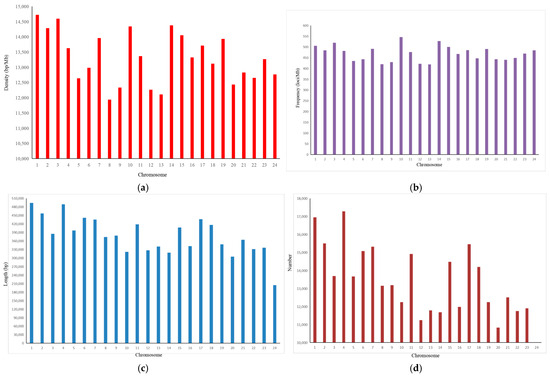 Chromosome-wide distribution of SSRs in A. latus genome. (a) Density of SSRs; (b) frequency of SSRs; (c) length of SSRs; (d) number of SSRs.
