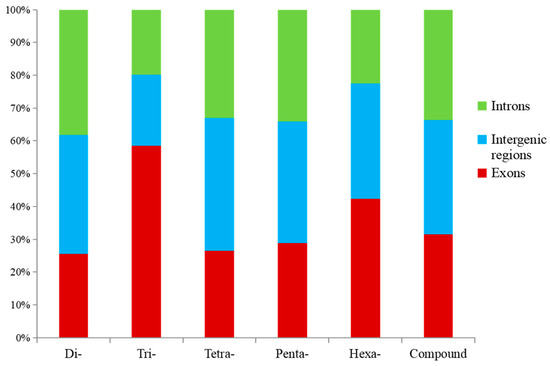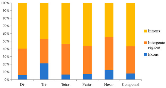 More than 128,939 SSRs (accounting for 56.91%) were located in intronic regions, followed by intergenic regions (78,256, 34.54%) and exonic regions (19,378, 8.55%) (Table 3). Dinucleotide SSRs were the major type in these regions (132,339), followed by compound SSRs (47,371) and trinucleotide SSRs (31,651) (Table 3). The largest proportion of each SSR repeat was in intronic regions (44.67–59.69%), followed by the intergenic (31.68–42.68%) and exonic (5.98–21.03%) regions (Figure 4). More than 7909 dinucleotide SSRs were found in exons, followed by trinucleotide (6655) and compound (3776) SSRs (Table 3). The relative percentage of trinucleotide SSRs located in exons was highest in all SSR repeats, followed by hexanucleotide SSRs (Figure 5).