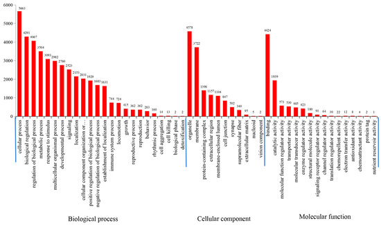 GO enrichment analyses revealed the SSR-containing exons to be distributed into 51 GO terms from three major categories: (i) biological process (6129; 32.81%), (ii) cellular component (6853; 36.68%), and (iii) molecular function (5701; 30.51%) (Figure 6). In the cellular-component category, the most abundant terms associated with genes containing SSRs were “organelle” (GO:0043226), “membrane” (GO:0016020), and “protein-containing complex” (GO:0032991) (Figure 6). “Binding” (GO:0005488) and “catalytic activity” (GO:0003824) constituted major portions under the molecular-function category (Figure 6). In the biological-processes category, most genes were enriched in “cellular process” (GO:0009987), “biological regulation” (GO:0065007), and “regulation of biological process” (GO:0050789) (Figure 6). Some expanded genes enriched in GO annotations, such as “intracellular anatomical structure” (GO:0005622), “nucleic acid binding” (GO:0003676), “zinc ion binding” (GO:0008270), and others [4], were also found (Table S4). In addition, “arrestin domain containing protein 3” (ARRDC3) and “solute carrier family 12 member” (SLC12A) were detected in GO annotations (Table S4).